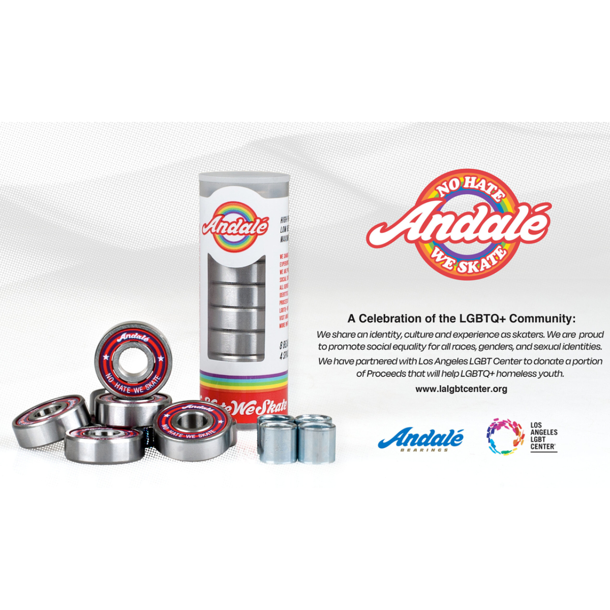 En tant que riders, nous partageons une identité, une culture et une expérience. Nous sommes une communauté basée sur l’expression de soi et nous sommes fiers de promouvoir l’égalité sociale et l’inclusion de toutes les races, de tous les genres et de toutes les identités sexuelles. Andalé Bearings a établi un partenariat avec le Los Angeles LGBT Center afin de reverser une partie des recettes au LOS ANGELES LGBT CENTER pour aider les sans-abri LGBTQ+ dans le besoin.